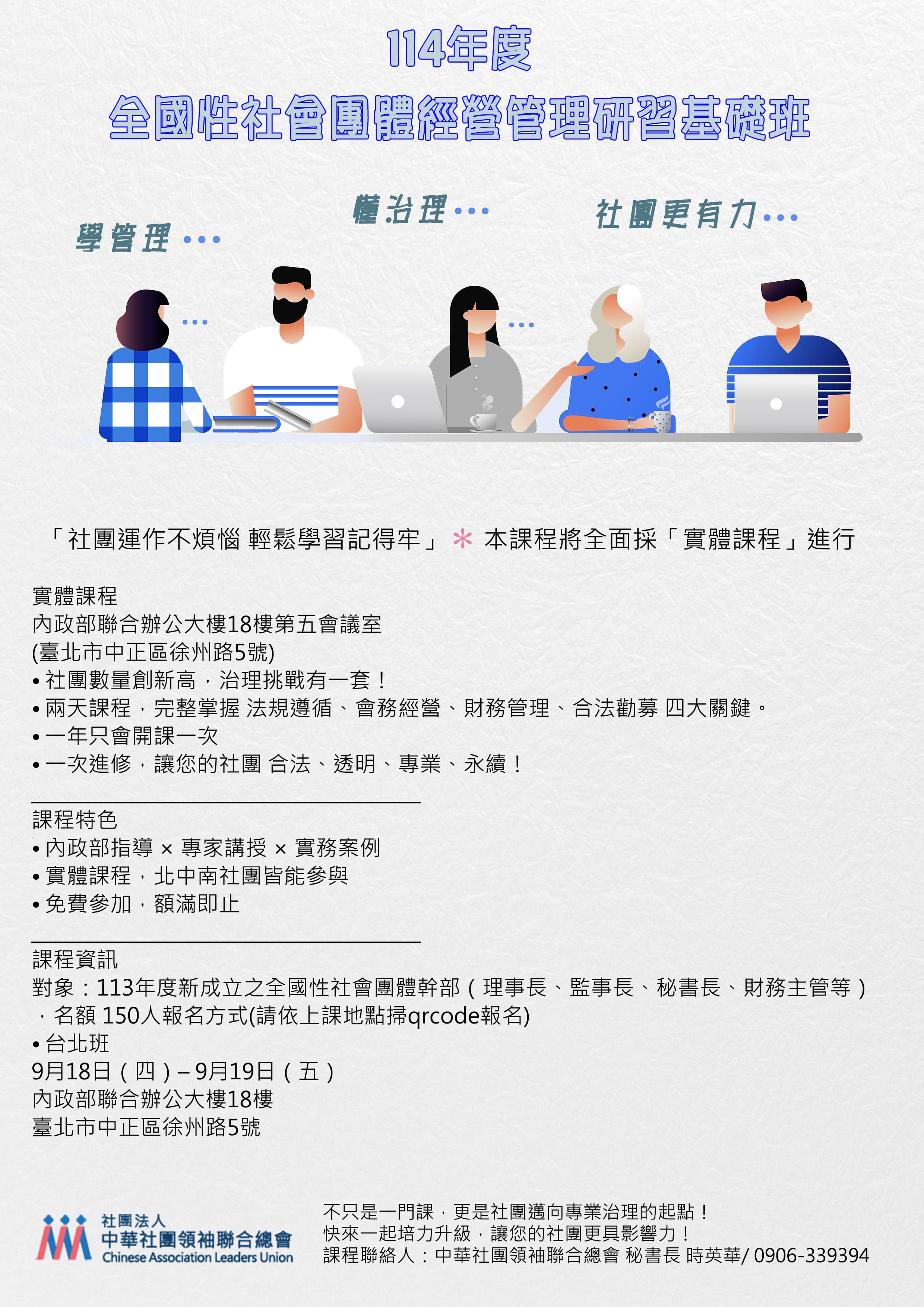 課程聯絡人:中華社團領袖聯合總會 秘書長 時英華/ 0906-339394